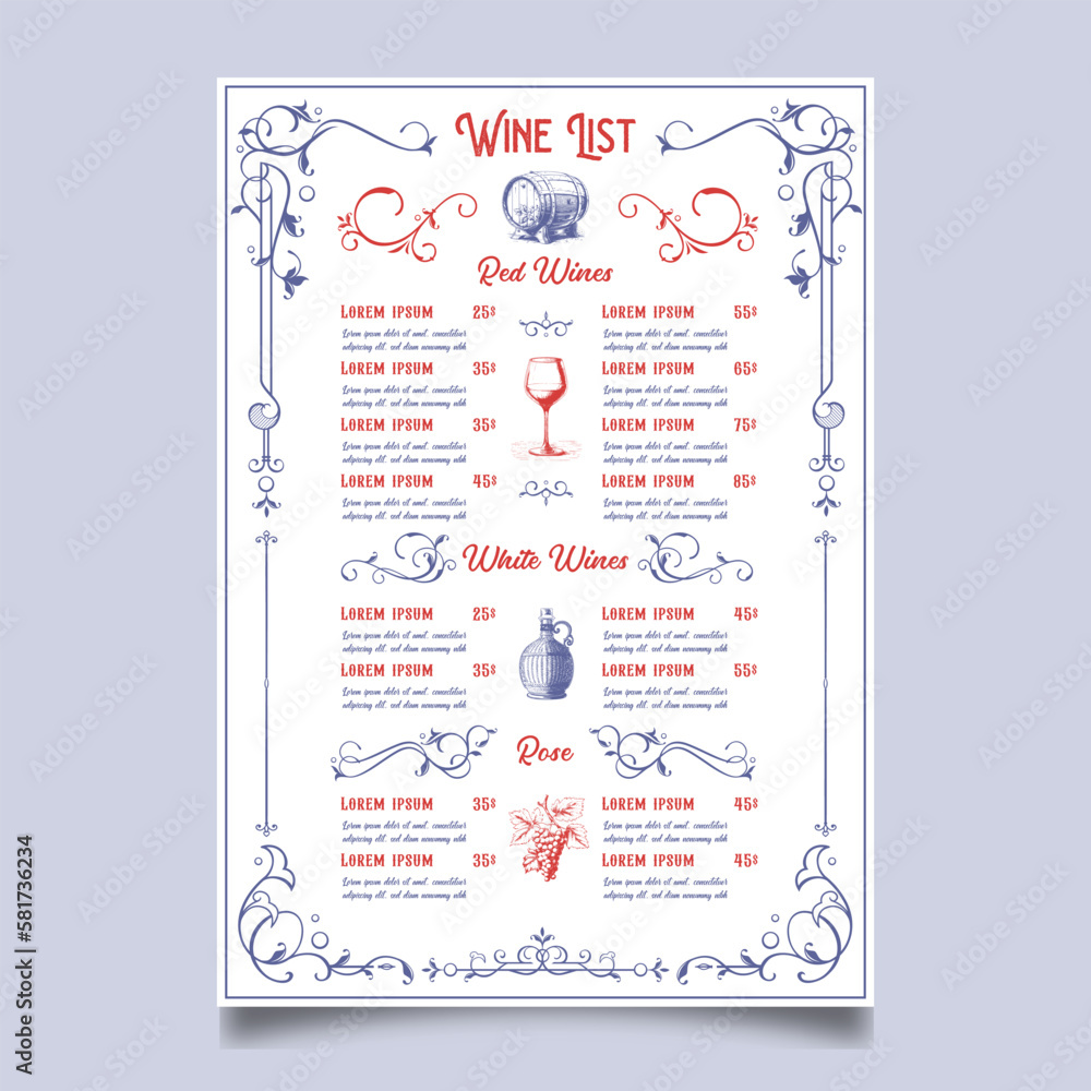 Vintage Wine list with a price list. Wine menu for restaurant in Very well made.